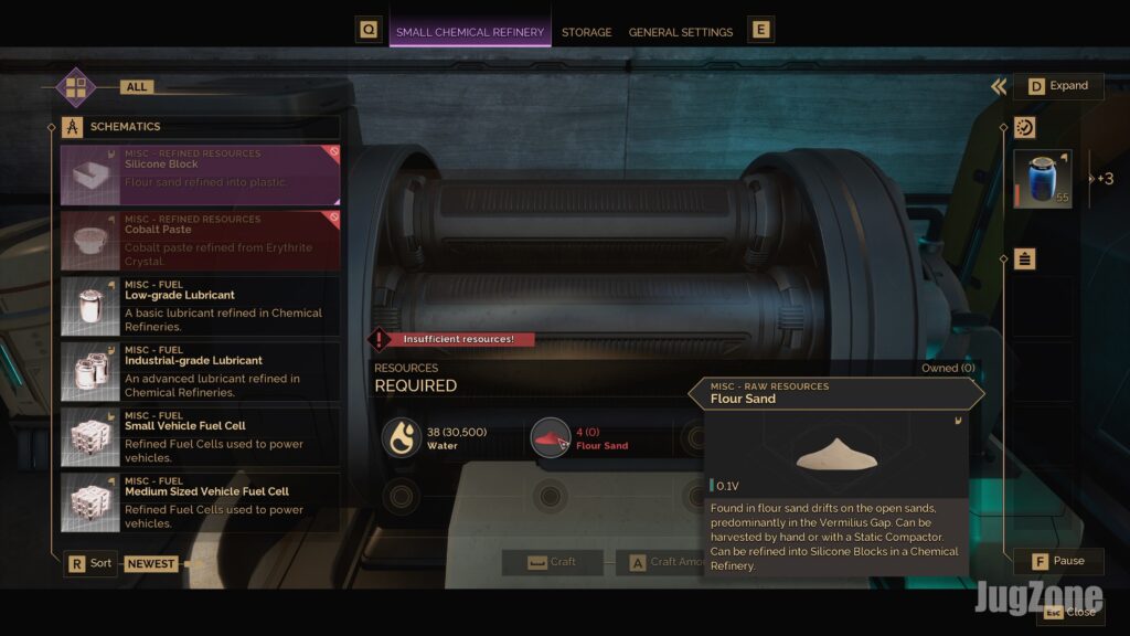 Flour Sand is key because it’s used to craft Silicone Blocks—an ingredient you’ll need for just about everything mid- to late-game, from advanced base upgrades to high-end gear. To make one block, you’ll need about five Flour Sand, and 50 Water in a Chemical Refinery. Not bad compared to some other recipes. It’s also pretty lightweight at 0.1 per unit, so you can carry a good amount. Still, since you’ll be farming this stuff by the hundreds, bring a vehicle with storage. A buggy or sandbike makes a big difference when you’re trying to load up in a single run.