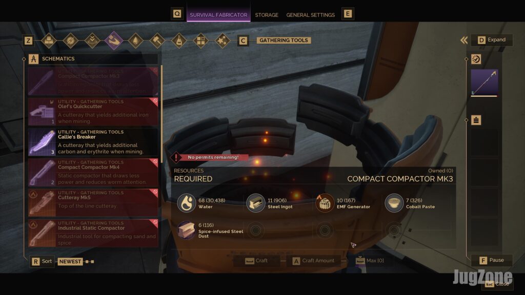 - Static Compactor: The Static Compactor is the only tool that lets you effectively harvest Flour Sand (and Spice Sand), compacting loose sand into collectable clumps. You’ll need to unlock its blueprint by completing the Second Trial of Aql, or loot one from an enemy camp. To craft it, use a Fabricator with 10 Iron Ingots (smelted from Iron Ore and Water) and 7 EMF Generators, which can be found in sealed Fremen caves or looted from camps. Once it’s built, make sure it’s in your inventory before heading out—you don’t want to realize you left it at base mid-run.